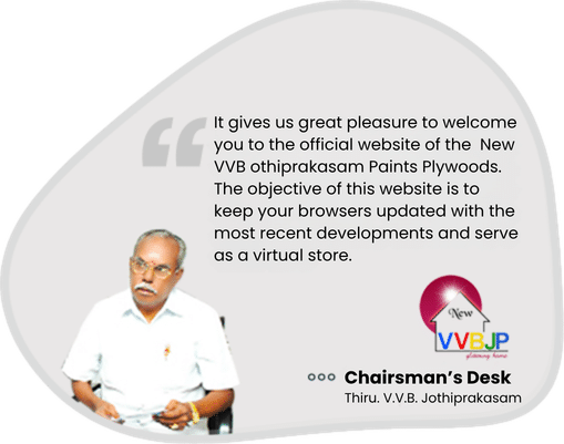 It gives us great pleasure to welcome you to the official website of the New VVB Jothiprakasam Paints Plywoods. The objective of this website is to keep your browsers updated with the most recent developments and serve as a virtual store.
